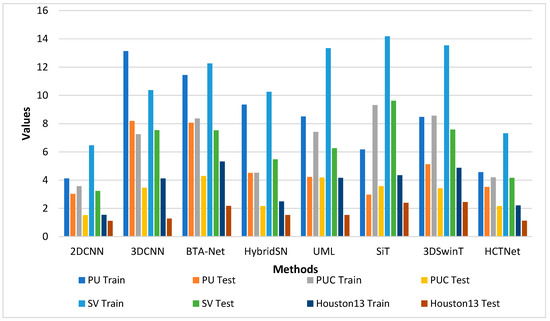 In the PUC dataset, for nine land covers, 7456 samples are available, which is less than the PU dataset. In addition, to avoid overfitting, we trained all models on 90% samples and validate on 10% samples. Other experimental setups were the same as those used for the PU dataset. The performance for each class and OA, AA, and Kappa value is shown in Table 4. Table 4 shows that the BTA-Net achieved an accuracy of 98.12% for the Self-Blocking Bricks land cover. UML achieved the highest classification, 97.82%, for Asphalt, whereas SiT obtained 98.84% accuracy for Tiles class. The 3DswinT obtained an accuracy of 97.57% for the Meadows class.