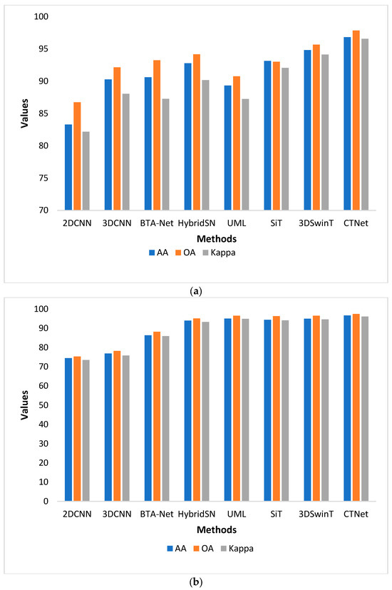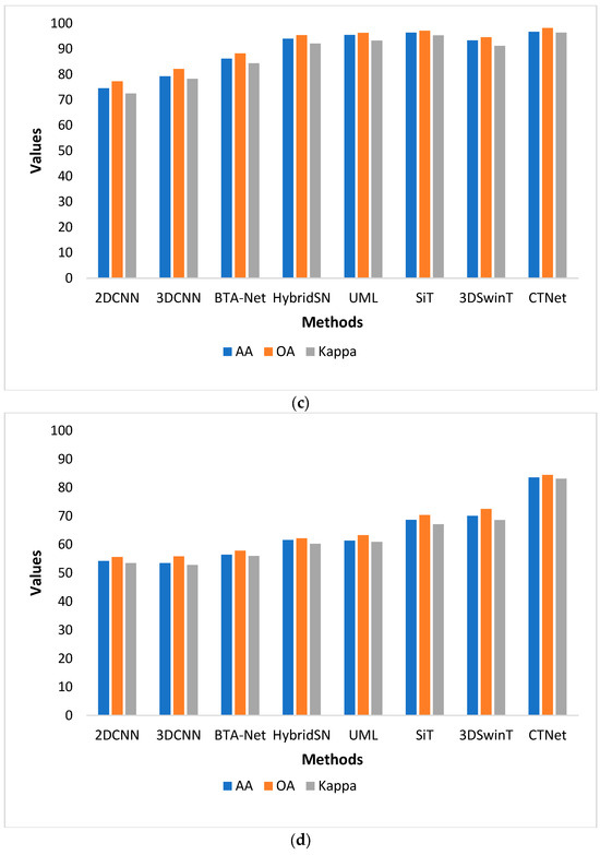 We experimentally evaluated the performance of the 2DCNN [24], 3DCNN [36], BTA-Net [40], HybridSN [37], UML [42], SiT [43], and 3DSwinT datasets [41] and proposed CTNet on the PU, PUC, SV, and Houston13 datasets. All the methods were evaluated under the same experimental conditions for a fair comparison. We plotted these models’ AA, OA, and Kappa scores, as shown in Figure 14. In Figure 14a, we notice that the OA accuracy of classical CNN-based methods is relatively low compared to transformers. The 3DSwinT obtained the second-highest OA of 95.68%, whereas 2DCNN achieved the lowest OA of 86.75% on the PU dataset. On the PUC dataset shown in Figure 14b, UML, SiT, and 3DSwinT, we obtained OA values that were very close to each other. Meanwhile, the proposed CTNet showed superior performance compared to other methods. In Figure 14c, we can observe that the AA accuracy of the SiT is very close to that of the proposed CTNet. At the same time, the lowest AA accuracy can be noticed in the 2DCNN and 3DCNN methods. In addition, the Kappa values of the HybridSN and 3DSWinT are very close to each other. On the Houston 13 dataset shown in Figure 14d, the OA of the classical CNN and transformer-based methods is below 90% due to there being fewer samples in each land cover. The OA of the 2DCNN and 3DCNN are close to each other. Transformer-based methods SiT and 3DSWinT obtained AA values of 68.7% and 70.05%, respectively. Meanwhile, the proposed CTNet achieved an AA value of 83.58%.