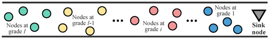 Similar to [13,14,15,16,17,18,19], we consider a dense LWSN, in which more than one node can exist in each grade. Such a topology differs from strictly linear WSNs, e.g., [20,21], in which there exists only one line of nodes.