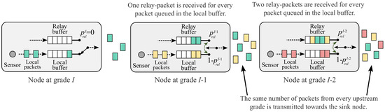 To achieve a homogeneous throughput, nodes at grade (which are the most distant nodes from the sink that relay packets) should receive, on average, the same number of packets from grade I as the number of packets they queue in their local buffers. As a result, the nodes at grade transmit the same number of packets from grades I and to grade . Similarly, the nodes at grade should receive, on average, two relay packets from grade for every packet queued in its local buffer so that nodes in grade can transmit the same number of packets from grades I, , and to grade . In general, to make sure that the data packets experience homogeneous throughput across the entire network, a node at grade i must receive, on average, relay packets for every packet queued in its local buffer. This means that should be times larger than . This concept is illustrated in Figure 3.