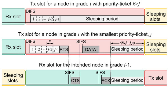 In LWSNs running a DCPF MAC protocol, the nodes follow a cycle that consists of slots, which are arranged in the following order: a reception slot, a transmission slot, and consecutive sleeping slots that are included to reduce energy consumption. The total cycle duration is seconds, where T is the duration of one slot. The cycles for the nodes in the network are organized so that the transmission slots of nodes at grade are synchronized with the reception slots of nodes at grade i [13,19]. This synchronization allows data packets to be relayed from grade to grade i in a single slot.