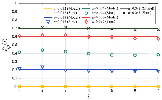 To obtain , one can solve a Discrete-Time Markov Chain (DTMC) for every grade i, whose steady-state solution is denoted by , for , and represents the steady-state probabilities of having m local and u relay packets in the corresponding queues. This DTMC depends on the probability of generating a local packet during a cycle (a) and the probability of selecting a packet from the relay queue (). The DTMC definition, its solution, and its relation with (2) and (3) are described in detail in [13], Section IV.B.