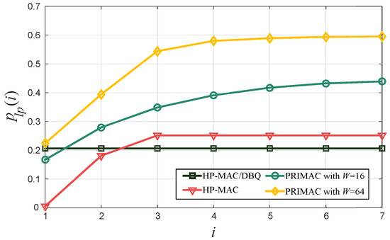 Figure 6 shows the PLP per grade i attained by our proposal, HP-MAC/DBQ, and two other state-of-the-art protocols, HP-MAC [13] and PRIMAC [19]. Since the performance of PRIMAC depends on the size W of the contention window, we consider two representative values, 16 and 64. As expected, the PLP for HP-MAC and PRIMAC degrades rapidly as the hop distance to the sink increases because data packets can be lost at each hop while competing for network resources with the locally generated data packets. On the other hand, HP-MAC/DBQ outperforms the other protocols for all grades except those closest to the sink, which is the result of assigning more resources to the packets generated upstream.