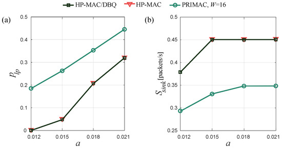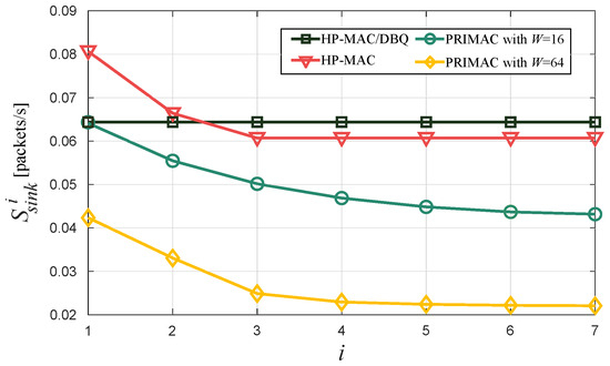 In Figure 8a,b, we present the network-wide average PLP and throughput attained by the protocols as a increases, respectively. The figures show that the overall performance exhibited by HP-MAC/DBQ is equivalent to that of HP-MAC, indicating that the proposed DBQ scheme does not have a negative impact on the network-wide performance of HP-MAC. This is mainly due to two reasons. Firstly, the DBQ scheme does not interfere with the underlying contention avoidance scheme and does not require additional signaling. Secondly, by solving (13), the DBQ scheme assigns the appropriate amount of network resources to data packets, ensuring that all packets have roughly the same probability of reaching the sink, regardless of their originating grade. The figure also shows that both HP-MAC and HP-MAC/DBQ outperform PRIMAC.