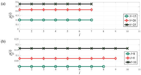 In Figure 9a,b, we present the PLP performance of the LWSN in terms of I and N, respectively. In these evaluations, we have assumed a value of . We notice that as an inherent effect of increasing the network size, the PLP increases as N or I increases. It is important to note that despite the high-intensity traffic, the uniform performance remains unaffected, which means that remains constant throughout the network for any given input parameters.