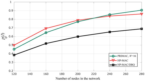 Lastly, to illustrate how our proposal improves the reliability of the network, we show the PLP for the most remote nodes of the network, , in Figure 10. For these results, we consider and . We observe that, for 120 nodes, all the protocols exhibit similar performances. However, as the total number of nodes increases in the order of hundreds (we increase N from 15 to 35), for PRIMAC and HP-MAC tends toward 1, which means that the sensing of the most remote regions of the network becomes very unreliable. By contrast, the implementation of the DBQ scheme maintains a more reliable sensing of the whole network under a wider range of possible scenarios. Evidently, these reliability improvements are limited by the network capacity.