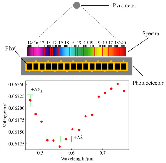 As can be seen in Figure 1, the pyrometer radiates the energy of the measured target at different wavelengths to each pixel of the photodetector and then converts the spectral energy into a voltage signal through photoelectric conversion. However, the spectra generated by the pyrometer are not completely linear. As a result, when calibrating the pyrometer, it is difficult to ensure the consistency of the data between various channels. In addition, distortion of the spectral line shape due to scattering phenomena causes crosstalk of energy between different detection channels, so the true voltage signal should be a value within the range of . The same problem also affects wavelength calibration during the assembly of the photodetector, so the true wavelength should similarly have a value within the range of .
