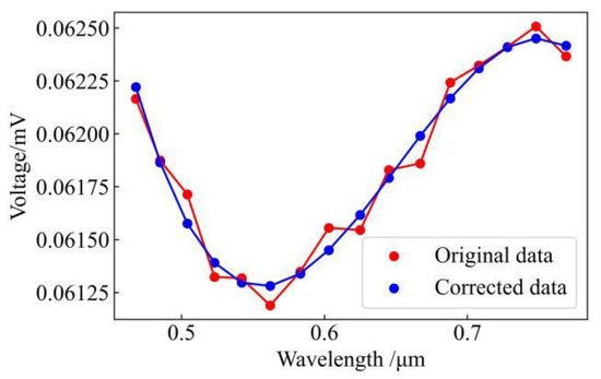 where , , and are correction factors within the value range [–1,1] and , , , are the maximum measurement error. The corrected spectral data are shown in Figure 2. From the figure, it can be seen that the original data have coarse errors in many places, while the spectral curves after correction become smoother and closer to the real situation, further illustrating the importance of data correction.