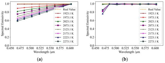In order to investigate the effects of the measurement errors , , and on the determination of spectral emissivity, the following tests were carried out during the experimental process: (1) estimation of spectral emissivity after correcting and ; (2) estimation of spectral emissivity after correcting and ; (3) estimation of spectral emissivity after correcting and . The results of these tests are shown in Figure 5.