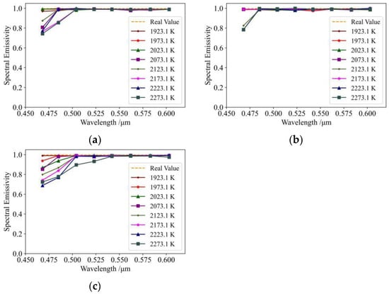 Effect of measurement error on spectral emissivity results: (a) spectral emissivity results after correction for and ; (b) spectral emissivity results after correction for and ; (c) spectral emissivity results after correction for and .