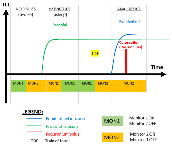 Remifentanil infusion was started by the anesthesiologist one minute later after TOF registration finished (MON2). During the induction, first, hypnotics was given, followed by analgesics. This was study-specific, so the design would allow the registration of the monitor during a period of hypnosis without analgesics, but with simultaneous nociceptive stimulus induced by a TOF monitor. Moreover, the muscular blockage was performed intravenously by the anesthesiologist with Rocuronium in case the tracheal intubation was needed. During the induction with analgesics infusion, intubation, or insertion of the laryngeal mask and incision, only one monitor remained connected to the patient and registered the patient’s response (MON2).