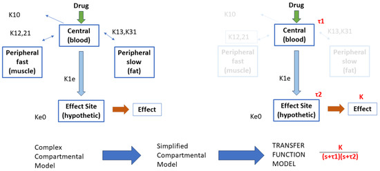A schematic flowchart is given in Figure 2. In this schematic, the variables denote the kinetic rate transfer in and out of the compartments and their clearances. The simplified compartment model is then considered as a first-order transfer function with time constant for central, respectively, for effect site compartment. The nonlinear Hill curve relating the effect site drug concentration to its effect in the body of the patient is replaced by a gain coefficient K. The dynamic response of this transfer function will be that of a second-order damped system, i.e., having two real poles as roots in the complex plane.