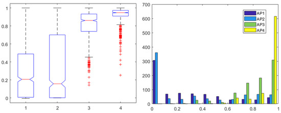 One-way ANOVA for the AP1 in first, AP2 in second, AP3 in third, and AP4 in fourth column (left) and histogram (right) for all 4 AP indices normalized for each patient.
