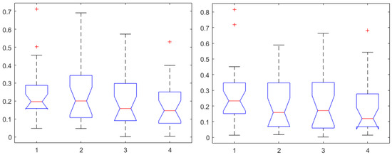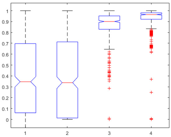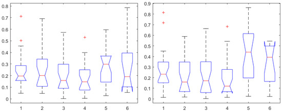 One-way analysis of variance was applied using Matlab function anova1. It gives a boxplot representation of median, quartiles’ percent, and outliers for groups of samples with normal distribution. Distribution tests, such as Anderson–Darling and one-sample Kolmogorov–Smirnov, were used to verify the sample distribution. The classification results were considered significant if (i.e., within 95% confidence interval) [48]. The results of this analysis can be found in the Supplemental Material.