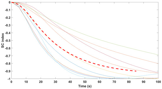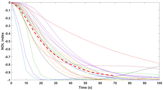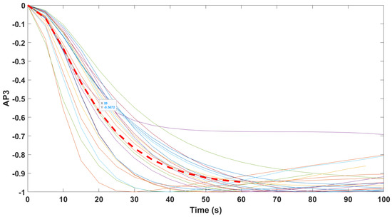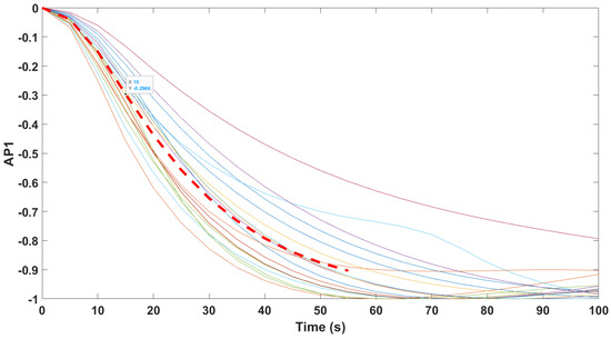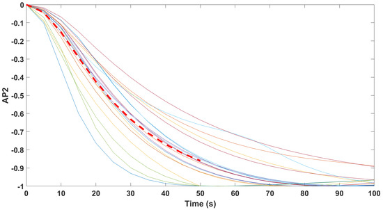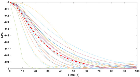 Finally, the mathematical relationship in an input (i.e., Remifentanil) to output (i.e., N/AN index) context of a dynamic system (patient) is the transfer function model [49]. The transfer function models identified from the index data for all monitors are summarized hereafter. For each patient, the normalized step response from the identified model is given in Figure 10 for the Medasense monitor, in Figure 11 for the Medstorm monitor, and in Figure 12, Figure 13, Figure 14 and Figure 15 for the AnspecPro monitor. The structure of the TF is , and in Table 3, we give the coefficients for the averaged transfer function models along with their standard deviations. Further details are provided in the Supplementary Material file.