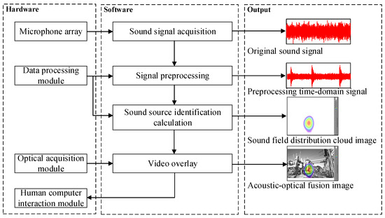 Sound source localization is realized through sound signal acquisition, sound signal preprocessing, sound source identification calculation, and video overlay, as shown in Figure 1. The specific steps are as follows.
