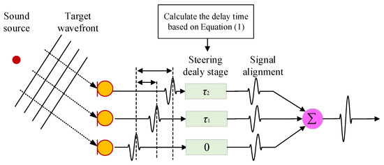 Step 1: According to the given scanning angle θ, the time delay between a sensor and the reference sensor is calculated. In Figure 3, sensor 1 is set as the reference sensor, and the time delay of each sensor τm can be calculated according to Equation (1).