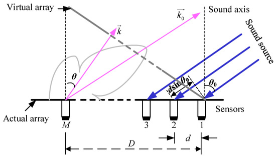 Assuming in a linear array, there are M sensors arranged at equal distances, as shown in Figure 3. The distance between two adjacent sensors is equal and represented by d. The angle between the array sound axis and the direction of sound waves is θ0. The specific description of the DSB algorithm process is as follows.