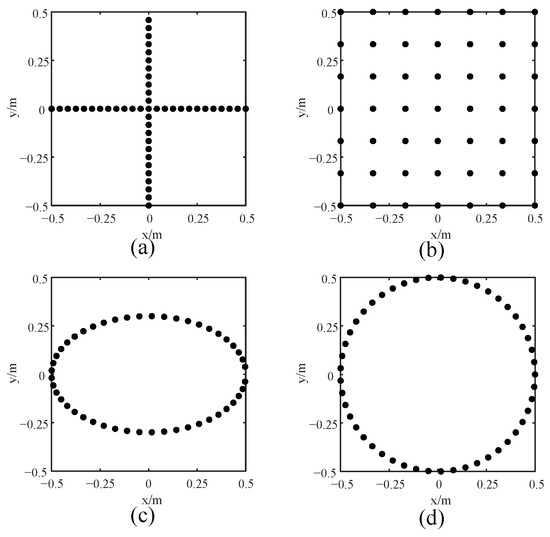 Array shape diagram: (a) crossed array, (b) rectangular array, (c) elliptic array and (d) circular array.