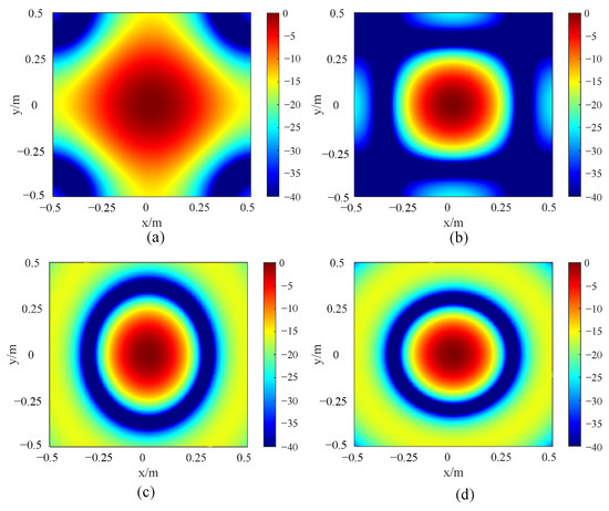 The 2D response images of arrays with different shapes: (a) crossed array, (b) rectangular array, (c) elliptic array and (d) circular array.