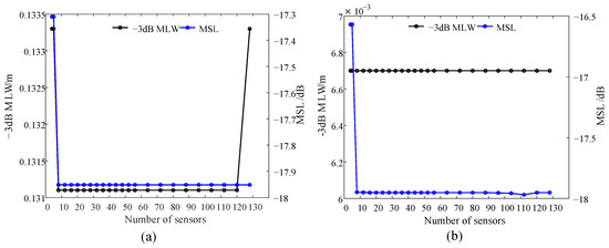 At 400 Hz, the −3 dB MLW and MSL almost do not change with the number of sensors when the number exceeds eight. The main reason is that the −3 dB MLW is only related to the array diameter and has little to do with the number of sensors. It should be noted that the change trend of 3 dB MLW at 7 kHz is independent of the number of sensors and that the change trend of the MSL is similar to that at 400 Hz.