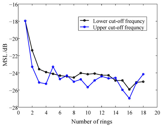 In Figure 8, at the lower cut-off frequency, the MSL shows a downward trend on the whole, mainly for the following reasons. On the one hand, as the number of rings increases, ds increases and dr decreases. The increase in ds leads to the increase in the MSL. In contrast, as dr decreases, the MSL decreases. It is dependent upon which of the two contradictory parameters has a greater influence on the trend of the MSL. The MSL is smallest when the number of rings is 16. The directivity functions with the number of rings of 1 and 16 are compared, as shown in Figure 9. As it can be observed, when the number of rings is 16, the side lobe is very small, and the anti-interference ability is the strongest. When the frequency is 7 kHz, the MSL change rule is similar to that of 400 Hz.