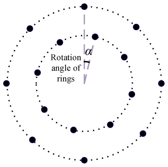 For two adjacent rings, the anticlockwise rotation angle of the outer ring relative to the inner ring is the rotation angle α, as shown in Figure 10. Taking the LF instrument as an example, the influence of α on the array performance is studied. The number of rings is fixed at 16, and the number of sensors is set to 112. The rotation angle α ranges from 0° to 50°. The MSL is obtained as shown in Figure 11.