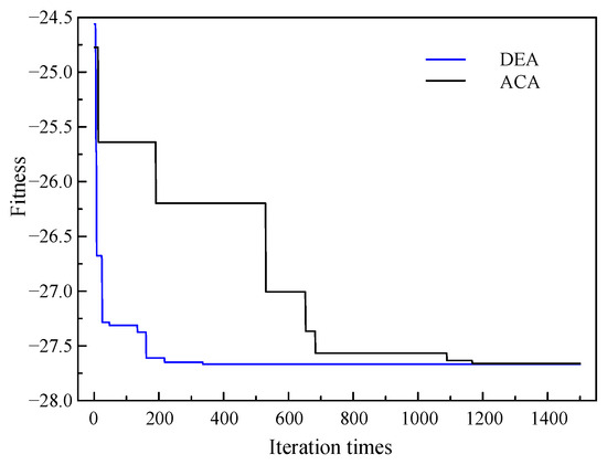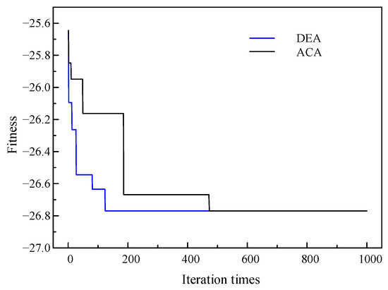 Based on the boundary conditions shown in Table 6, the optimal microphone array topology can be obtained through the optimization algorithm, as shown in Table 7. Figure 16 shows the convergence characteristics of the fitness function. It can be seen that the curve change rule is similar to the LF instrument. The DEA and the ACA both produce the same result, indicating that this result is the global optimal solution.
