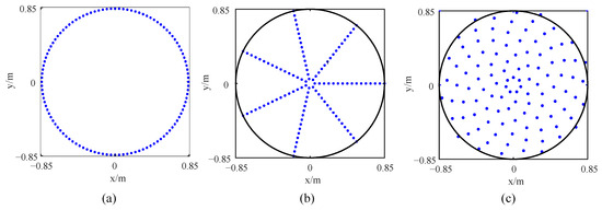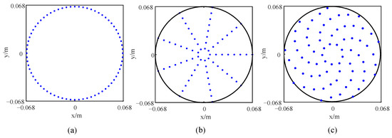 To verify the performance optimization effect of the improved array, the original array is designed, which is consistent with the number of sensors of the improved array. All sensors in the original array are equidistantly distributed on a ring, as shown in Figure 14a. The sensors in the quasi-improved array are evenly distributed on multiple rings, and the number of rings and number of sensors are consistent with the improved array. At the same time, the distance between each two adjacent rings dr in the quasi-improved array is equal, and the rotation angles θj are all set to be zero, as shown in Figure 14b. According to Table 4, the topology of the improved array can be drawn, as shown in Figure 14c. In particular, the quasi-improved array is a special array obtained by optimizing the number of sensors and the number of rings. Actually, if these two parameters are uncertain, it is difficult to obtain the quasi-improved array by the exhaustive simulation analysis and comparison one by one. The response of the arrays is shown in Figure 15. The comparison of the MSL can be found in Table 5.