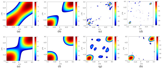 Simulation results of arrays’ recognition effect under two sound sources: (a) quasi improved LF array at 400 Hz, (b) improved LF array at 400 Hz, (c) quasi improved LF array at 7 kHz, (d) improved LF array at 7 kHz, (e) quasi improved HF array at 5 kHz, (f) improved HF array at 5 kHz, (g) quasi improved HF array at 20 kHz and (h) improved HF array at 20 kHz.