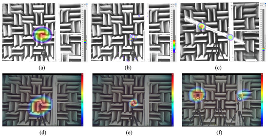 According to Figure 21, it can be seen from group 1 and group 2 that the spots are concentrated near the actual location in the acoustic–optical fusion image, and the color is the brightest at the actual location, indicating that both sets of instruments can accurately identify the single sound source at the cut-off frequency.