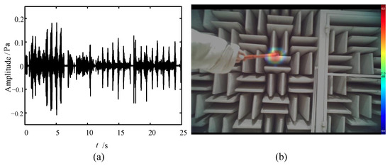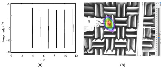 The transient sound source generated by typical intermittent mechanical vibration is simulated. The time domain diagram is shown in Figure 22a. The LF instrument is used; the test results are as shown in Figure 22b. It can be seen from Figure 22 that the instrument can successfully capture this mechanical vibration sound source and locate it accurately.