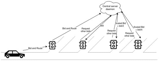 Traditionally, signalized intersections have been managed by static and fixed-timed traffic lights [18]. On the other hand, in [19], which is a foundational paper in vehicle coordination, the authors proposed a method for coordinating both autonomous and human-powered vehicles through traffic lights considering a First Come–First Served policy. A different approach was presented in [20,21], in which two traffic lights competed with each other to reach the highest value of green time. In [2,9], the authors proposed and evaluated how to exploit traffic lights through auction systems for improved traffic management at intersections. Micro-auctions were exploited in [22] in a decentralized manner to determine the next signal phase. Reinforcement learning was adopted in [23] to obtain an optimal bidding strategy. In [24], reinforcement learning was used to learn the traffic signal policy, and other works have used variants of reinforcement learning as well [25,26]. In [27], the authors’ goal was to minimize the personal delay of drivers through an auction for green time. In [28], the authors used a second-price marked approach for auctions. The importance of such auctions is that drivers are able to define their Value of Time (VOT), as in [29,30]. Another important aspect is incentive compatibility, as analyzed in [31]. If a driver is not incentivized to adopt the system and to avoid cheating for personal gain against the overall system, then the system performance degrades; this aspect was considered in [32,33]. The authors of [34] focused on CO2 emissions. They proposed a smart traffic light system that has the goal of regulating traffic flow to reduce emissions. Multi-intersection road networks were taken into consideration in [35], where the authors proposed a consensus prediction method to coordinate connected vehicles through more intersections. In [36], UAVs were exploited to detect congestion in traffic flows and change traffic light behaviors in response. In [2] and its evaluation in [9] the authors proposed exploiting traffic lights with an auction systems to better manage traffic at intersections. In our work, we extend this concept by enabling coordination among traffic lights in order to obtain a wider view of the actual traffic situation.