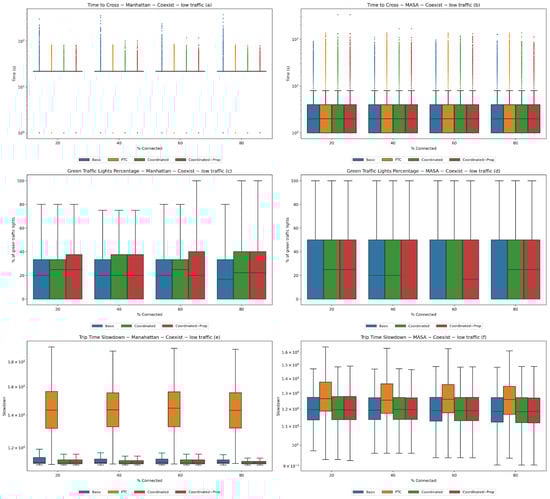 Experiment 2—low traffic. Coexistence of connected and non-connected vehicles with 1000 total vehicles. Statistics for the Manhattan (a,c,e) and MASA (b,d,f) maps.
