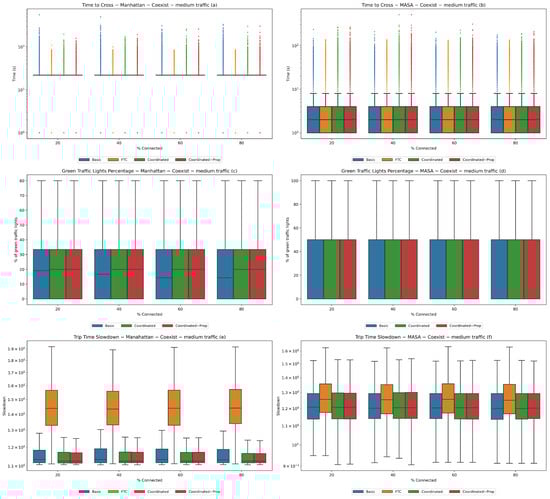 Experiment 2—medium traffic. Coexistence of connected and non-connected vehicles with 2500 total vehicles. Statistics for the Manhattan (a,c,e) and MASA (b,d,f) maps.