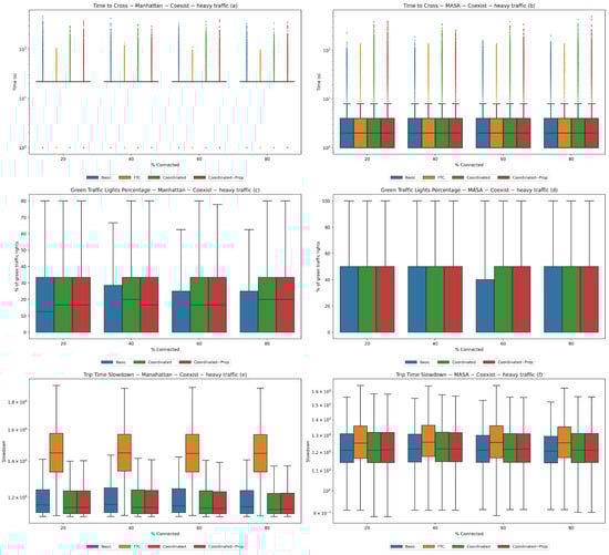 Experiment 2—heavy traffic. Coexistence of connected and non-connected vehicles with 4000 total vehicles. Statistics for the Manhattan (a,c,e) and MASA (b,d,f) maps.