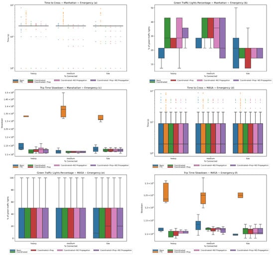 For trip slowdown, we observe that the coordinated system has the best performance on both maps with heavy traffic; slowdown values are comparable to those occurring for the vehicles in the low traffic scenario, with smaller variances. This means that the emergency vehicle’s trip time is faster than that of the other vehicles in the best scenario, indicating that the proposed strategy works. It can additionally be seen that the FTC system has the worst performance on both maps. On the Manhattan map, the basic system has the worst performance among the auction-based systems, especially with heavy traffic, while on the MASA map it is competitive only with low traffic.