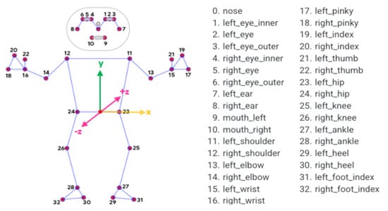 In the literature, there is a plethora of HPE models with varying properties. The choice of the most suitable model depends on the application’s requirements. Our selection criteria focused on single-person recognition, the number of detected body keypoints, returned coordinates for each keypoint, computational power requirements, and the detection rate. The model that effectively meets the requirements of our approach is BlazePose [10].