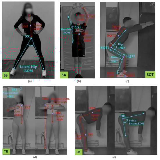 Kinematic analysis (KA) of the exercise repertoire. The first row includes (a) SS, (b) SA, and (c) SQT while the row below contains (d) TR and (e) FB. We mark the guidelines that involved inspection for execution errors in red, while we mark the studied angles for the ROM testing in blue.