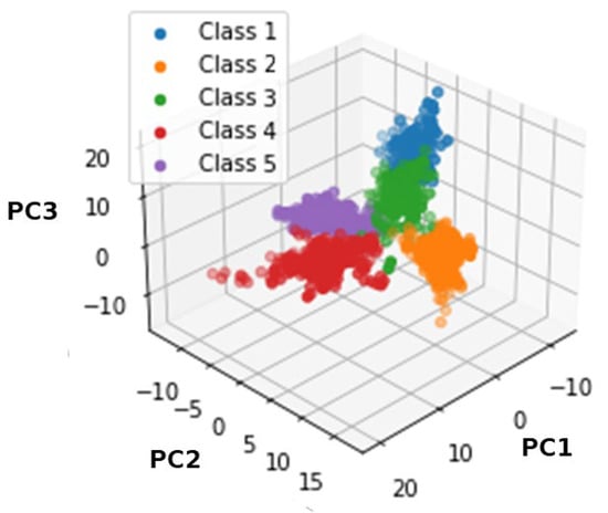 Visualization of the classification problem using the three first principal component analysis (PCA) components. Class 1 corresponds to the SS, class 2 corresponds to the SA, class 3 corresponds to the TR, class 4 corresponds to the FB, and class 5 corresponds to the SQT exercise.