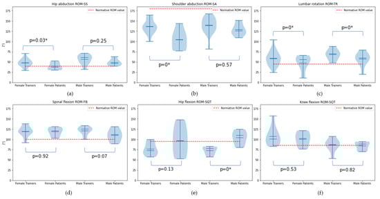 Violin plot representations of the study population’s ROM, performance comparison between patients and trainers, and visualization of the normal ROM values. Testing: (a) hip abduction ROM for SS, (b) shoulder abduction ROM for SA, (c) lumbar rotation ROM for TR, (d) spinal flexion ROM for FB, and (e,f) hip and knee flexion ROM for SQT exercise. We mark the normative ROM values in red. The statistically significant differences are marked with an asterisk (*).
