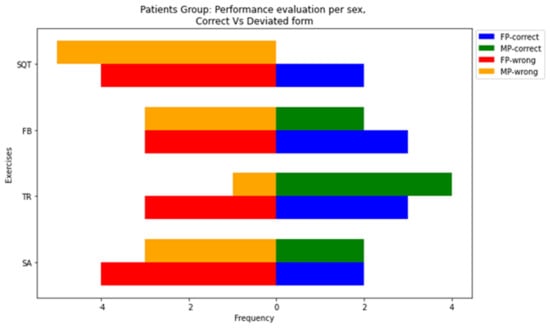 Patient performance evaluation by sex. Female patients who performed without and with execution errors are represented by blue and red, respectively, while male patients who performed without and with errors are represented by green and orange colors, respectively.