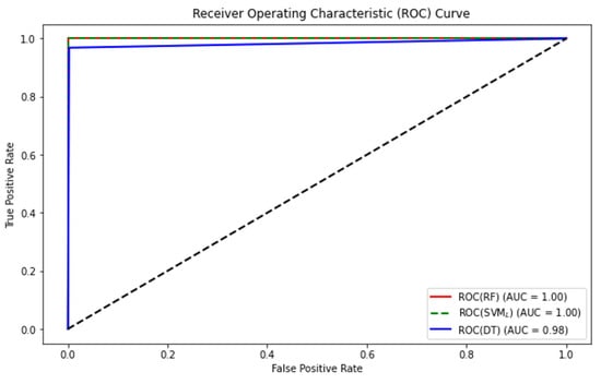 As shown in Table 2, after a meticulous evaluation, the RF classifier outperformed due to its ability to achieve high test set accuracy (100%). However, concerns regarding overfitting and computational efficiency prompted the integration of PCA into the workflow. Post-PCA integration, we re-evaluated the classifiers’ performance. We observed a marginal decrease in RF’s accuracy (99.63%) and an increase in the classifier’s accuracy. Notably, after PCA application, SVM’s accuracy increased to 100%. With this result, the data can be considered linearly separable. Τhis finding can be easily observed in Figure 4. As evidenced by the high area under the ROC curve (AUC = 1.00) in Figure 7, our ML model has strong discriminatory power and performs well across different decision thresholds. We opted for the classifier, achieving a remarkable accuracy of 100% for each class as displayed in Figure 8. The computational efficiency gains achieved through PCA were evident, enabling faster model training and inference contributing to an improved response rate and overall performance of our real-time TE system.