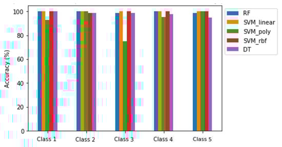 Various classification algorithms, such as random forest (RF) [20], support vector machine (SVM) [21], and decision trees (DT) [22], were explored to address the classification problem. We evaluated three different kernel mappings: linear (), polynomial (), and radial basis function (). DT was included as a baseline method, keeping in mind the overfitting problem of the algorithm [20].