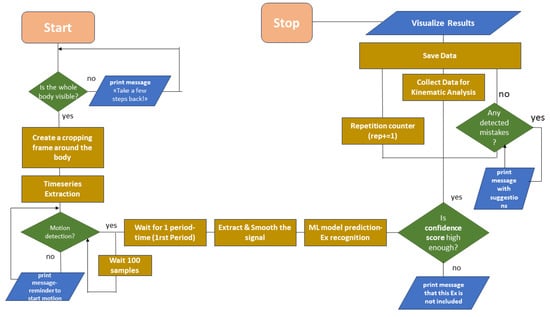 Based on our findings, we developed a cutting-edge TE system designed to offer users meticulous guidance through visual feedback messages on their screens. As presented in Figure 9, we included several functionalities such as exercise recognition, repetition counting, inactivity and change in exercise detection, correction of execution errors, and ROM data analysis.