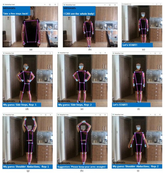 The TE system’s demonstration for the real-time testing scenario: (a) state: user’s body is not fully visible; (b) state: user’s body is fully visible; (c) state: user is inactive; (d) state: first exercise recognition, SS; (e) repetition counter initiation; (f) state: user is inactive again; (g) state: second exercise recognition, SA; (h) state: SA exercise, execution error detected; and (i) state: SA exercise, improved performance. Each figure includes the actual exercise, the identified keypoints and skeleton, and a blue feedback ribbon on the bottom that includes the detected exercise and repetition and, when an error is identified, the suggestion for correction.