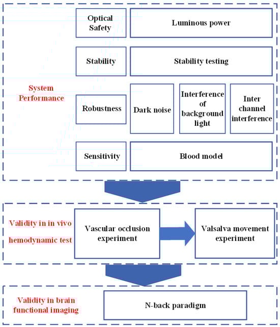 We have gradually deepened the testing of the system, and if mistakes were made in some steps, they could be quickly corrected. Firstly, to ensure the safety requirements, we need to evaluate its basic capabilities, including stability and robustness. Then, simple model experiments were performed, from the forearm to the brain, ranging from simple measurements of changes in blood oxygen signals during vascular blockage to changes in blood oxygen under task-specific stimuli. After these preparations, the usual experimental tasks were finalized, and the results were tested after the data had been processed to ensure that the device could be used for functional brain imaging. Using this protocol, developers and researchers can clearly identify where and how the CW-fNIRS system problems emerged and systematically assess the instrument's performance as a third-party test facility or self-assessment.