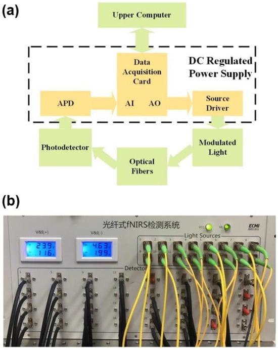 In this study, our self-developed CW-fNIRS system was taken as the test object. The system architecture was commonly used in the current CW-fNIRS technology (Figure 2a). With the support of an industrial stabilized power supply, a data acquisition card (PXIE-6368, National Instrument, Austin, TX, USA) was used to control the source, detector, and data transmission. The light source and the detector transmit/receive photons through optical fibers in contact with the human scalp. The light sources are laser diodes (LD), and two wavelengths (780 nm and 850 nm) are coupled as a group using a fiber splitter. LD light source, developed by QSI (QL78M8S-A, ProPhotonix, Hertfordshire, UK), adopts sinusoidal modulation of different frequencies, and the digital locking technology of the upper computer can suppress noise in signal transmission to a large extent. The detector is an Avalanche photodiode (APD) developed by Hamamatsu (C12703-01, Hamamatsu Photonics, Hamamatsu, Japan) with an amplifier gain of 1.5 × 108 V/W, a bandwidth of 100 kHz, and an equivalent noise power of 0.02–0.04 pW. The specific device has 16 LDs (8 groups) and 32 detectors. The system sampling rate can be set from 1 Hz to 200 Hz. The appearance of the system is displayed in Figure 2b.