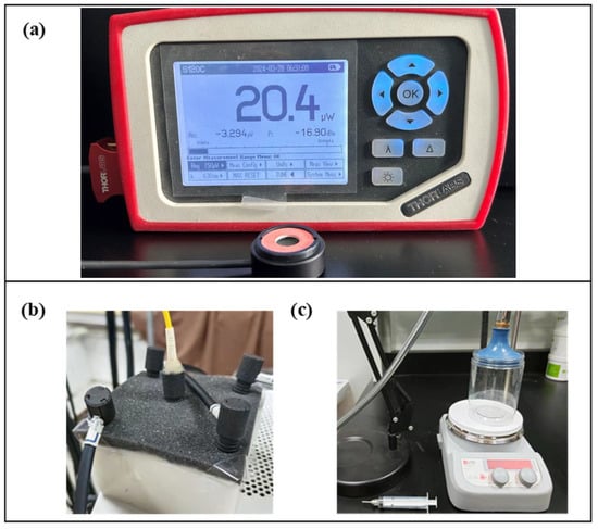 In a fiber-contact scheme where the source spot size is determined, the fluence varies only as the luminous power. The luminous power of each light source was measured with a luminous power meter developed by Thorlabs, Newton, NJ, USA (PM100D, Figure 3a).