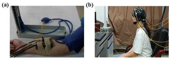 The subjects sat in a comfortable chair, kept their body relaxed, and performed a series of operations according to the voice cues (the participants’ participation in the experiment is shown in Figure 4b). The subjects remained relaxed from the beginning to 25 s. At 25 s, there was a sound stimulus (start), and the subject performed the Valsalva movement and kept it for 30 s. After 30 s, a second acoustic stimulus (end) appeared, at which time the subject began to calm down and continued for some time.